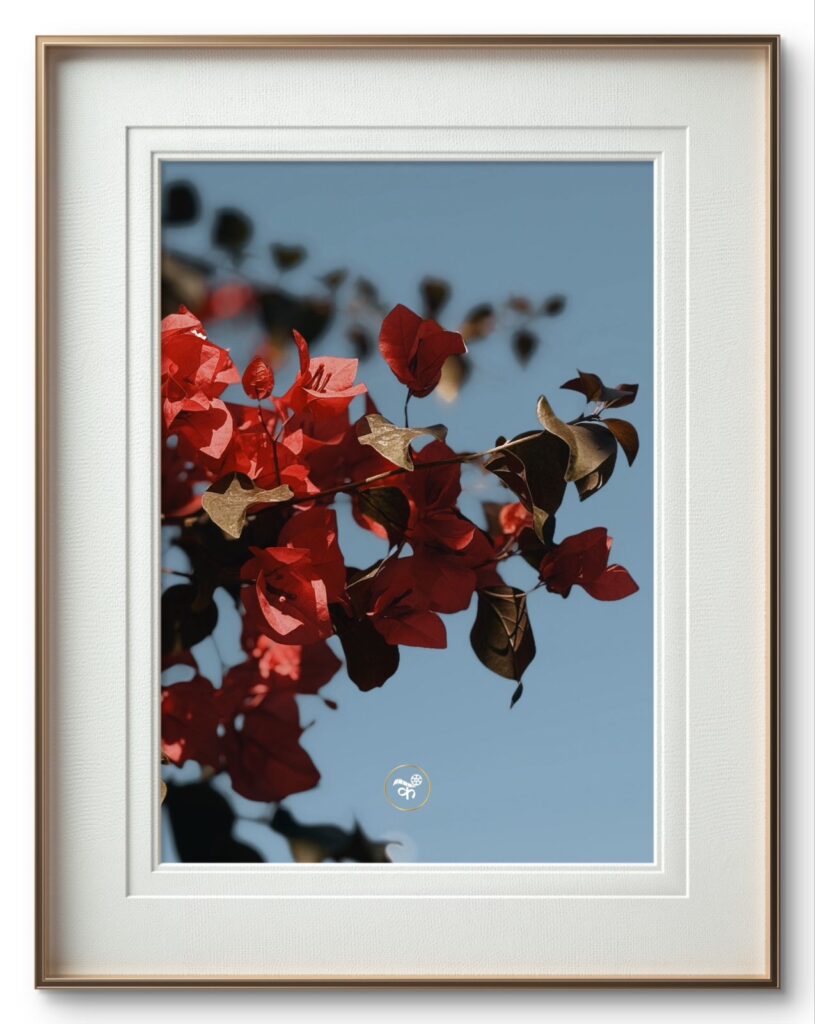 What interests me here is not the flower, but its decision to face the light. These petals feel less like decoration and more like small acts of defiance; red, shades of pink and peach against an endless blue, warmth interrupting distance. As if colour itself refused to be quiet. As if, femininity urged to make a point with the sun’s unwavering support. The branch reaches into the sky the way a thought reaches into memory – selectively, delicately, holding on to what matters and letting the rest blur. The focus, shedding light on what deserves clarity and what can remain a whisper.